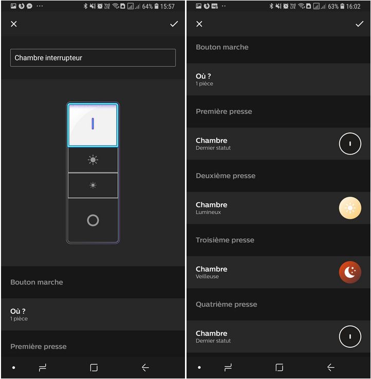 Par exemple, vous pouvez lui dire que si on appuie une fois sur le bouton marche, l'ampoule doit retrouver l'état qu'elle avait la dernière fois qu'elle s'est éteinte. Ensuite, vous pouvez lui dire que lorsque vous appuyez deux fois, elle doit se mettre en luminosité maximale, et s'il y a trois appuis alors en mode veilleuse. Ce n'est qu'un exemple et tout cela est totalement personnalisable ! Voyez par vous-même sur la copie d'écran ci-dessous.