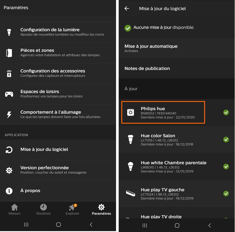 Pour réaliser la mise à jour, il faut utiliser l'application Philips Hue. Il se peut que votre pont soit déjà à jour si les mises à jour automatiques sont activées. Accédez aux paramètres, puis sur la partie "Mise à jour du logiciel" pour vérifier et mettre à jour le firmware si besoin.