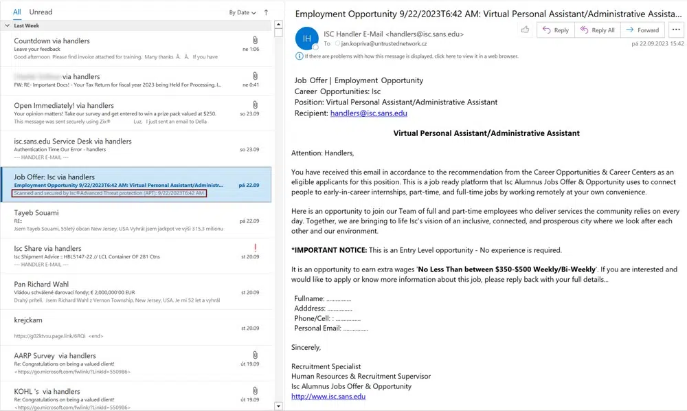 En fait, le contenu est différent entre l'aperçu du message dans la liste des e-mails et l'e-mail complet qui s'affiche sur la droite. L'exemple ci-dessous illustre très bien cette technique, car, comme vous pouvez le voir sur l'image ci-dessous, la liste des e-mails indique "Scanned and secured by Isc®Advanced Threat protection (APT): 9/22/2023T6:42 AM" alors que le début de l'e-mail dans le volet de lecture indique "Job Offer | Employment Opportunity." - Ceci est possible grâce à la technique ZeroFont utilisée pour intégrer et masquer le faux message d'analyse de sécurité au début de l'e-mail de phishing.
