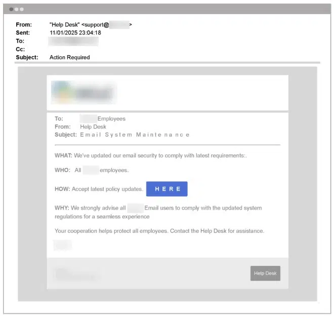 D'après Abnormal Security, les attaquants envoient des e-mails aux utilisateurs en usurpant l'identité du support informatique de l’organisation. Cet e-mail a pour objectif d'inciter les destinataires à mettre à jour leurs paramètres de sécurité en cliquant sur un lien présent dans le corps du message. Ce lien, quant à lui, redirige l'utilisateur vers une page web imitant à la perfection l’interface de connexion de l’ADFS de l'entreprise ciblée.