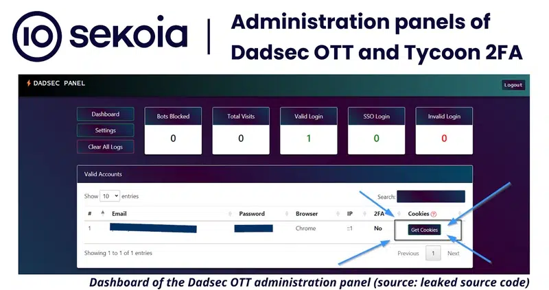 Les affiliés de Tycoon 2FA ont accès à un véritable tableau de bord d'administration au sein duquel ils peuvent visualiser les identifiants collectés avec l'identifiant, le mot de passe, l'état du MFA, ainsi que la possibilité d'obtenir des cookies d'authentification prêts à l'emploi.