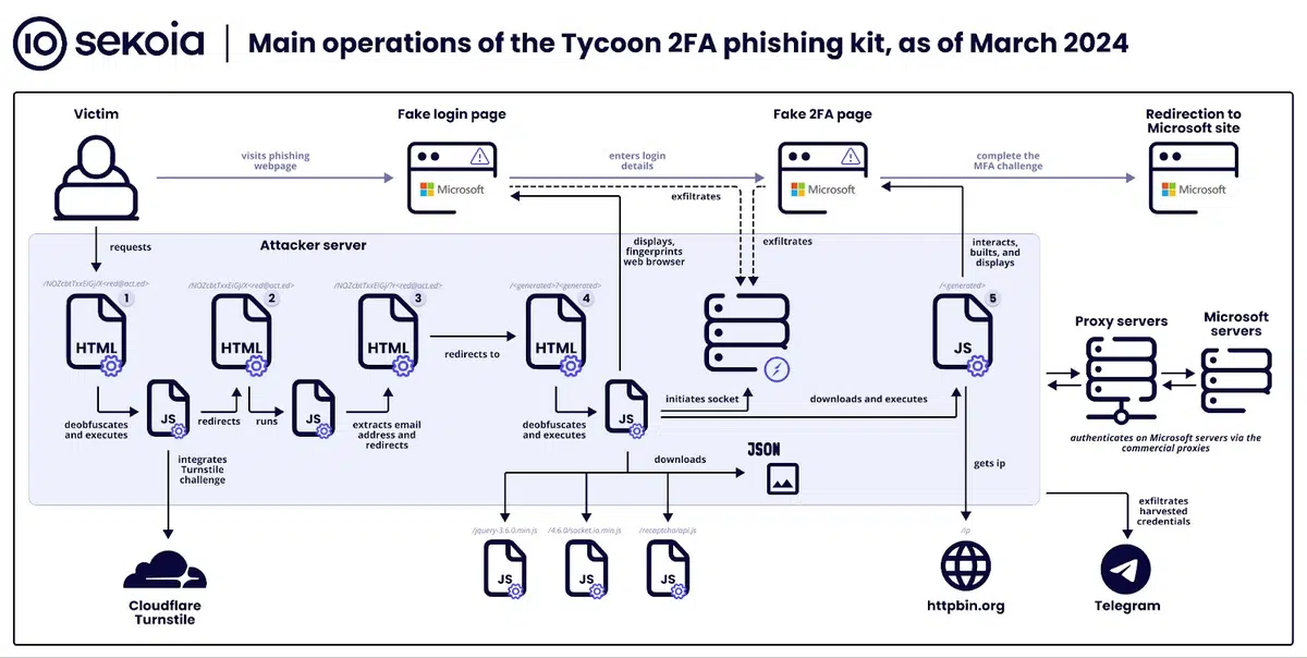 Comme le soulignent les équipes de Sekoia dans un nouveau rapport, ce kit de phishing prêt à l'emploi est en pleine évolution et une nouvelle version a été publiée en 2024 : plus efficace et plus furtive, notamment l'ajout de capacités de détection et de blocage des bots. Actuellement, Tycoon 2FA exploite 1 100 domaines et a été utilisé pour mettre au point des milliers d'attaques de phishing.