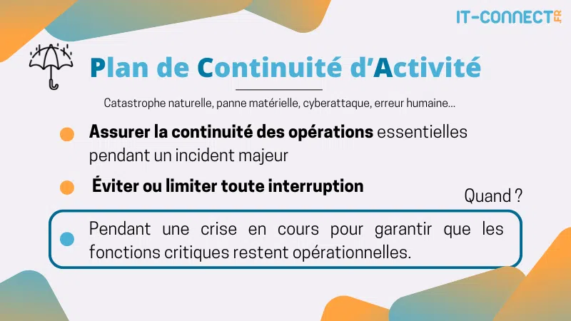 Il s’agit plus précisément des procédures organisationnelles et techniques à suivre pour redémarrer et restaurer le système d’information après un incident majeur ayant entraîné un arrêt total ou partiel du système d’information. L'objectif principal est alors de minimiser le temps d'arrêt et de récupérer les opérations normales et les applications critiques dans les plus brefs délais.