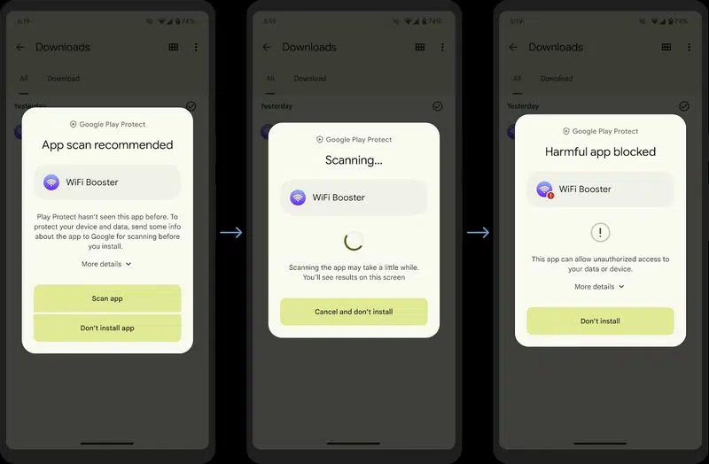 "Une fois l'analyse en temps réel terminée, les utilisateurs obtiendront un résultat leur indiquant si l'application peut être installée en toute sécurité ou si l'analyse a déterminé que l'application est potentiellement dangereuse.", précise Google.