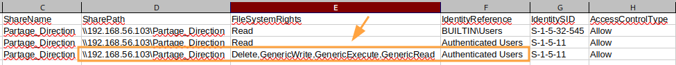 On voit ici que le groupe "Authenticated Users", c'est-à-dire tous les utilisateurs authentifiés du domaine, ont accès en lecture/écriture au partage "Partage_Direction", ce qui semble anormal.