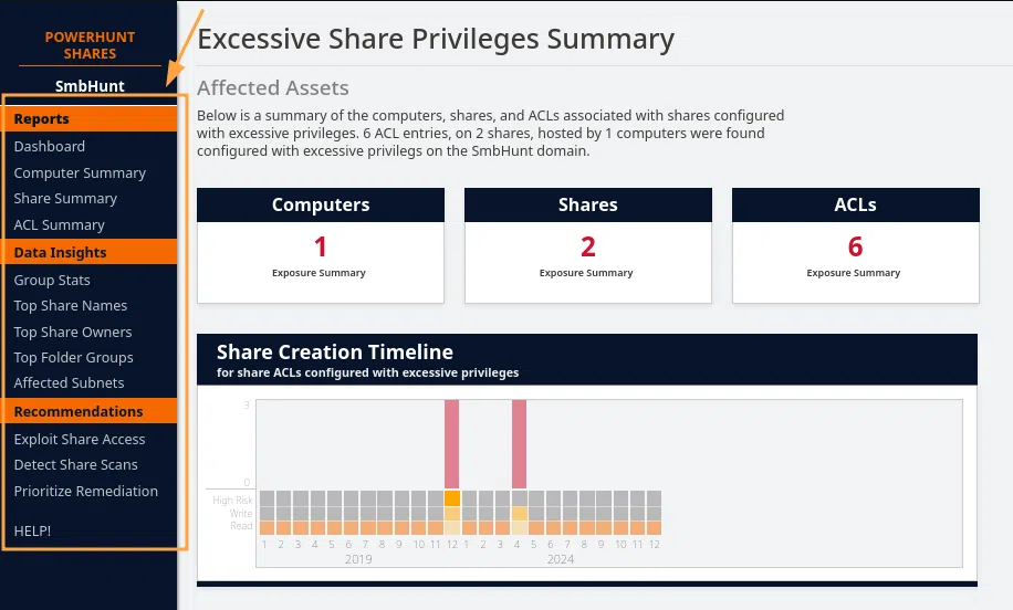 L'outil PowerHuntShares a été créé afin d'aider les équipes informatiques à répondre à cette problématique. L'objectif de cet outil est de permettre de réaliser un inventaire et une analyse des partages de fichiers et de leur permission au sein d'un domaine Active Directory. Il permet notamment d'identifier les privilèges excessifs ainsi que les partages "à risque", et génère un rapport au format web simple à parcourir et à utiliser :