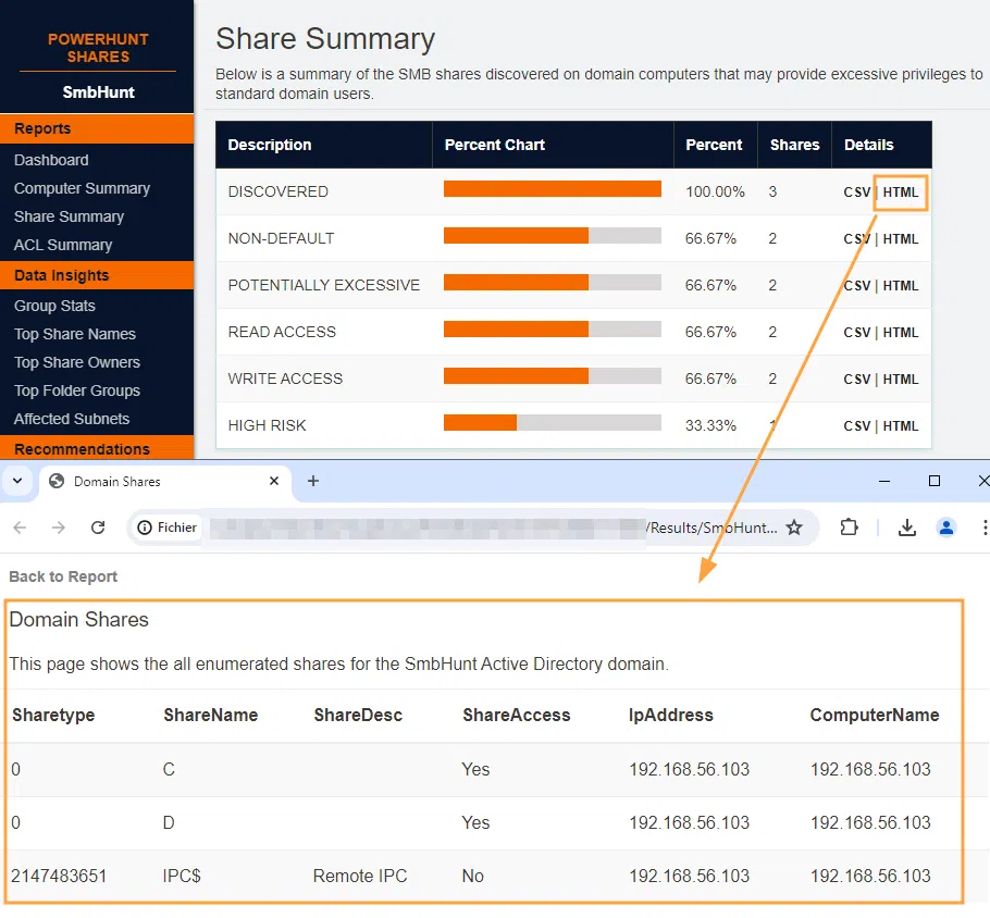 Nous allons à présent nous attarder sur le plus intéressant, le rapport HTML et CSV produit par PowerHuntShares qui synthétise les données collectées. Vous le trouverez dans le dossier que vous avez spécifié au lancement (option "-OutputDirectory") :