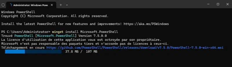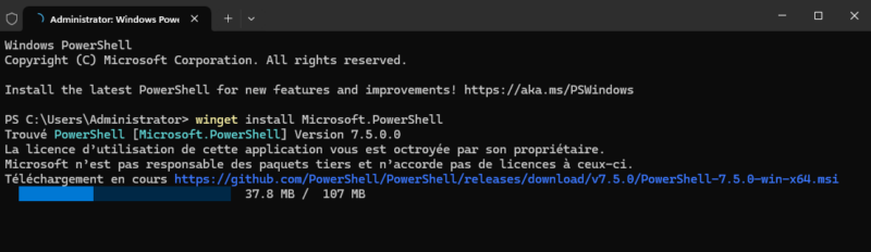 - Pour installer PowerShell, utiliser la ligne de commande suivante :