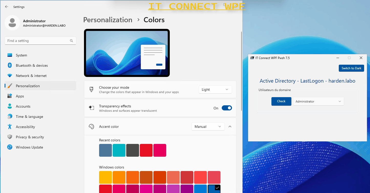 Pour changer de thème, il suffit de changer la propriété ThemeMode de l’objet Window. Pour cela, ce code PowerShell nous permet de changer à la volée le thème de l’application.