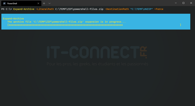 Voici un exemple pour décompresser le ZIP "C:\TEMP\ZIP\powershell-files.zip" dans le dossier ""C:\TEMP\UNZIP"" :