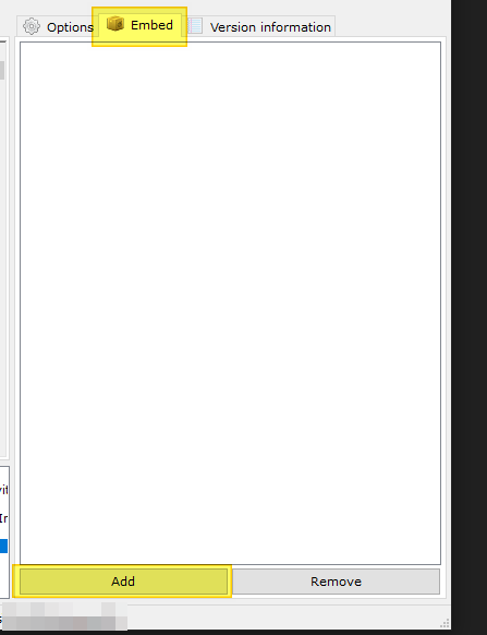 Enfin, si vous utilisez un fichier de configuration ou tout autre fichier que vous souhaitez intégrer à l'exécutable, c'est possible ! Cliquez sur l'onglet "Embed" et cliquez sur "Add" afin de rechercher le fichier à intégrer dans l'exécutable. Il est possible d'intégrer plusieurs fichiers, mais cela impactera forcément la taille de votre exécutable.