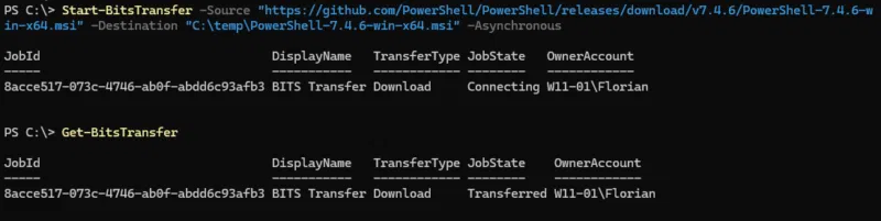 Start-BitsTransfer -Source "https://github.com/PowerShell/PowerShell/releases/download/v7.4.6/PowerShell-7.4.6-win-x64.msi" -Destination "C:\temp\PowerShell-7.4.6-win-x64.msi" -Asynchronous