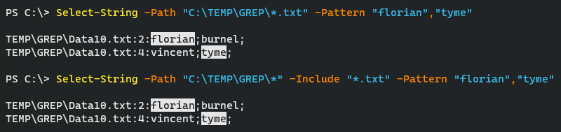 Select-String -Path "C:\TEMP\GREP\*" -Include "*.txt","*.csv" -Pattern "florian","tyme"