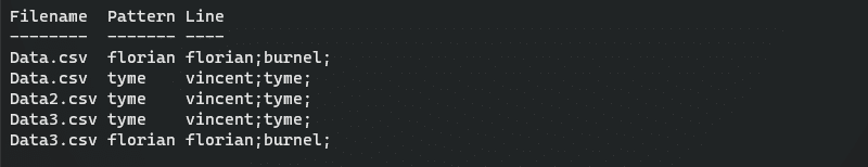 TEMP\GREP\Data.csv:2:florian;burnel; <fichier-où-se-situe-le-résultat>:<numéro de ligne>:<contenu de la ligne>
