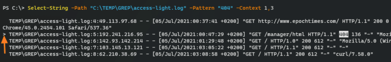 Select-String -Path "C:\TEMP\GREP\access-light.log" -Pattern "404" -Context 3