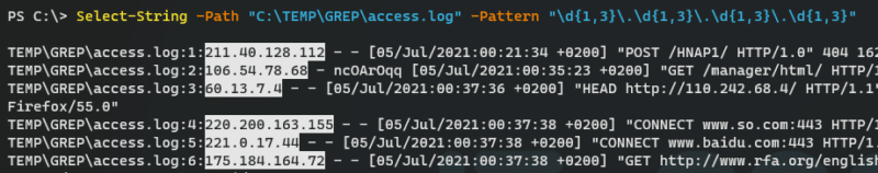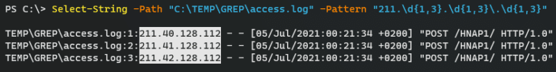 Select-String -Path "C:\TEMP\GREP\access.log" -Pattern "211.\d{1,3}.\d{1,3}\.\d{1,3}"