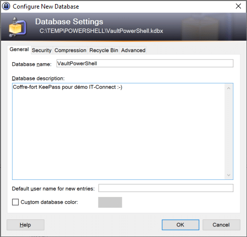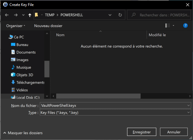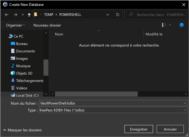 Spécifiez un nom pour le fichier et un emplacement (sécurisé). Il peut s'agir d'un partage ou d'un espace Cloud si vous souhaitez partager la base avec vos collègues ?. Pour ma part, ce sera "VaultPowerShell.kdbx".