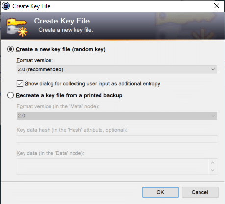 Choisissez "Create a nex key file (random key)" et cliquez sur "OK" : vous allez devoir agiter votre souris dans la zone à l'écran pour l'entropie, c'est-à-dire le fait de baser la génération de votre clé sur des mouvements imprédictibles.