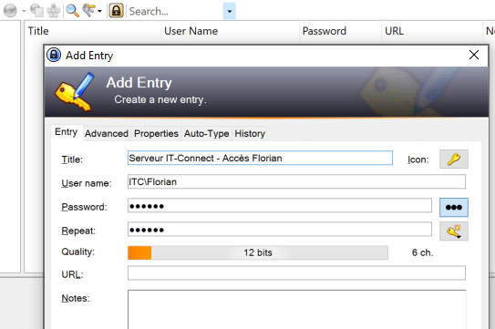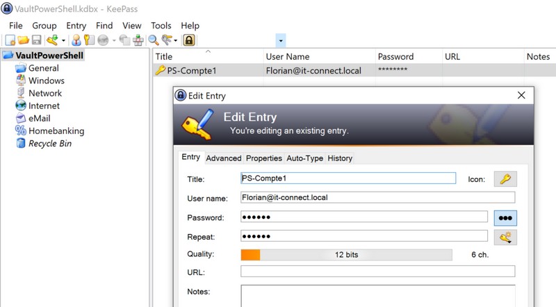 Sur la copie d'écran ci-dessous, on peut voir que l'entrée est correctement alimentée. Pour le moment, il n'est pas possible d'exploiter l'option -Metadata avec un coffre-fort KeePass.