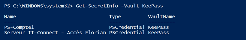 Pour lister le contenu de la base KeePass, la commande Get-SecretInfo doit être utilisée comme pour interroger un coffre-fort créé à partir de Secret Store.