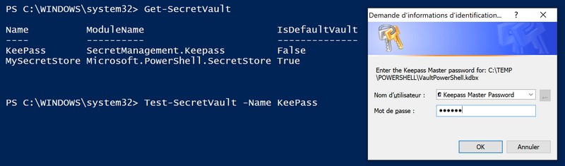 Dès lors que le module est installé et que notre base KeePass est prête, on peut enregistrer le coffre-fort au niveau de Secret Management grâce à la commande Register-SecretVault.