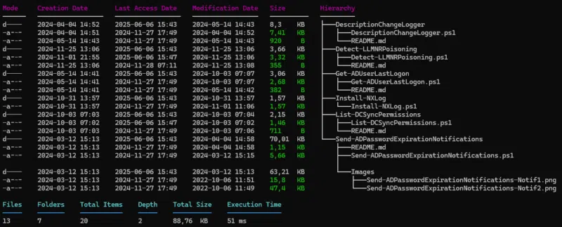 Contrairement à la commande tree intégrée à Windows, PowerTree peut afficher des informations détaillées sur les fichiers et les dossiers. C'est la valeur ajoutée de cet outil, au-delà qu'il soit open source et écrit en PowerShell.