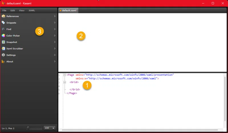 Une fois Kaxaml lancé, vous disposez de trois parties au sein de l’interface graphique :