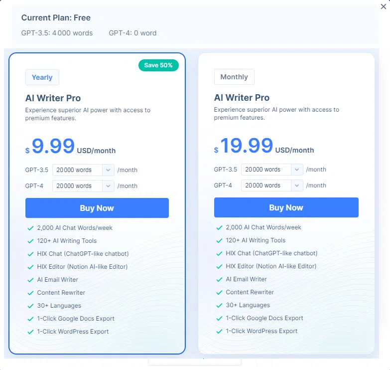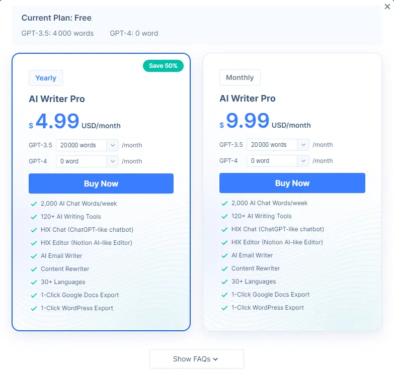 Par exemple, la version gratuite de l'outil AI Writer est limitée à 4 000 mots par mois, tandis que la version gratuite d'ArticleGPT est limitée à 1 article par mois. Dans tous les cas, la version gratuite se limite au modèle de langage GPT-3.5, comme ChatGPT.