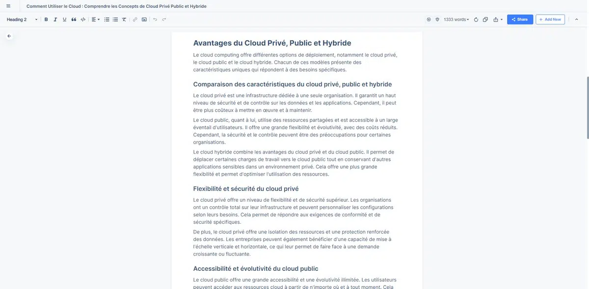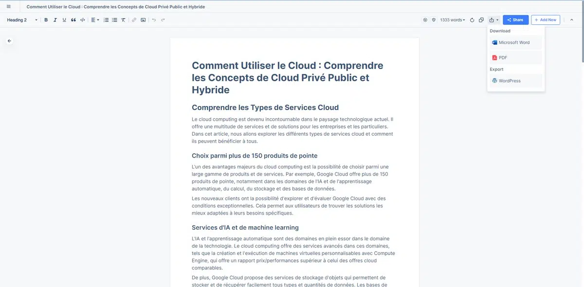 En moins d'une minute, l'outil a généré un outil de plus de 1 300 mots sur le sujet du Cloud, en couvrant le sujet dans son ensemble. Cet article peut-être exporté au format Word, en PDF, ou envoyé via WordPress (via la mise en place d'un mot de passe d'application). Ci-dessous, vous pouvez voir un extrait de l'article généré.