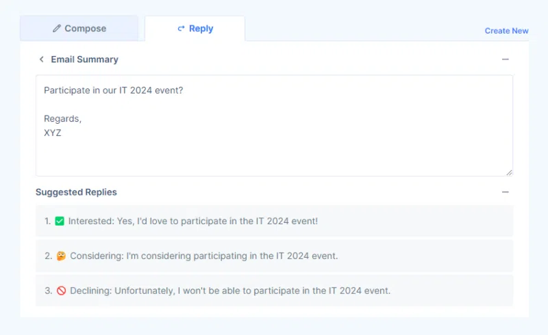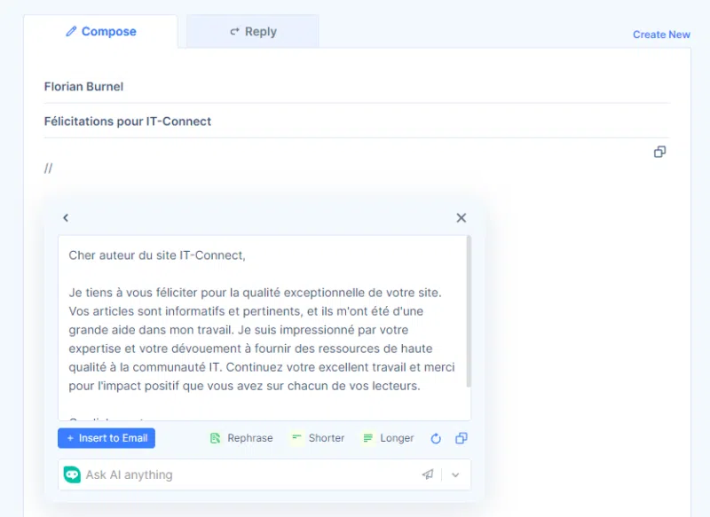 HIX Email Writer est capable de vous aider à répondre à un e-mail. Tout d'abord, il faut lui copier-coller l'e-mail en question (en français, cela fonctionne), et il va vous proposer plusieurs réponses. Prenons l'exemple d'un e-mail où l'on nous demande si l'on va participer à un salon IT. L'outil nous suggère plusieurs réponses, notamment pour accepter ou décliner l'invitation.