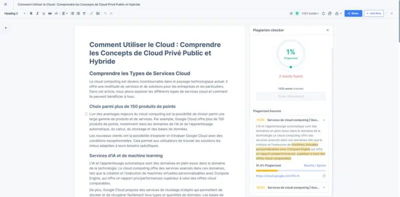 Par ailleurs, la fonctionnalité "Plagiarism checker", ou vérificateur de plagiat en français, permet de voir si l'IA n'a pas bêtement copié-collé un passage issu d'un autre article. C'est effectivement un risque avec une IA à partir du moment où elle a un accès à Internet... Grâce à cette fonctionnalité, vous pouvez effectuer une vérification et ainsi corriger l'article si c'est nécessaire.
