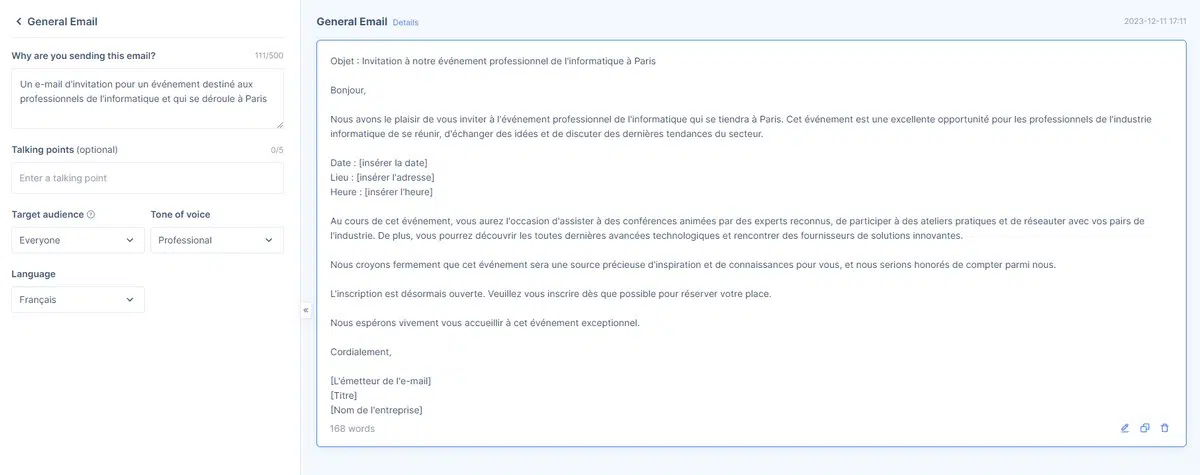 Il y a une vingtaine de modèles d'e-mails correspondants à des situations spécifiques. Si vous choisissez un modèle d'e-mail pour une réunion, il vous suffit d'indiquer quelques informations, comme la date et l'heure, et l'outil va s'occuper de vous proposer un e-mail correspondant.
