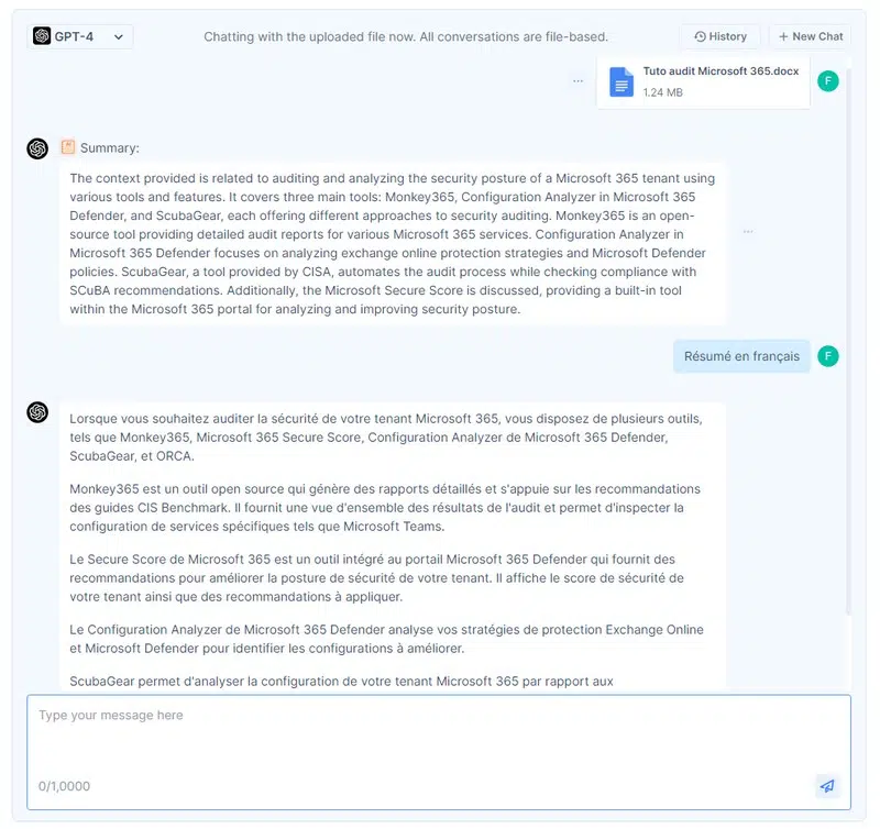 HIX Chat peut également analyser et résumer un document, que ce soit un fichier Word (docx) ou un PDF. Par exemple, ici j'ai chargé un document Word qui contient le contenu de mon article "Cybersécurité : comment réaliser un audit de son tenant Microsoft 365 ?" afin de lui demander un résumé. Il m'a proposé une synthèse en anglais, et a pu m'indiquer la version française de cette synthèse dans un second temps suite à ma demande. Finalement, la synthèse est assez pertinente et cette analyse peut faire gagner du temps sur un document conséquent.