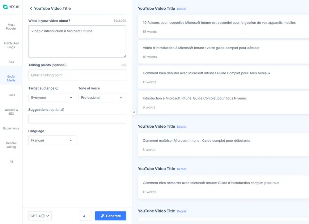 Bien que l'interface soit en anglais, HIX.AI peut générer du contenu dans plusieurs langues, y compris en français. Il suffit de choisir la langue de son choix dans les paramètres de son compte.