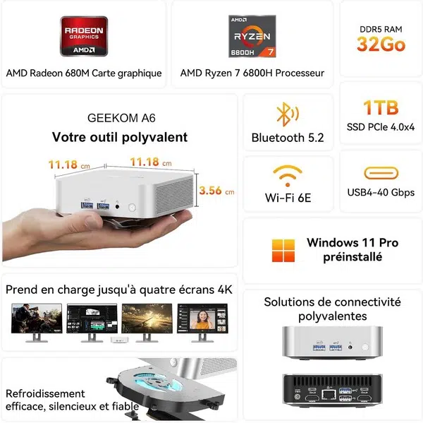 C'est l'un des modèles les plus récents de la marque, le Geekom A6. Son boitier en aluminium renferme un processeur AMD Ryzen 7 6800H, 32 Go de RAM en DDR5 et 1 To de stockage avec un SSD NVMe. Il est également bien équipé en matière de connectique et connectivité grâce au Wi-Fi 6E, Bluetooth 5.2 ainsi que 2 ports HDMI, une interface réseau 2.5 GbE et même des ports USB4. D'une manière générale, plusieurs modèles de mini PC Geekom partagent la même connectique.
