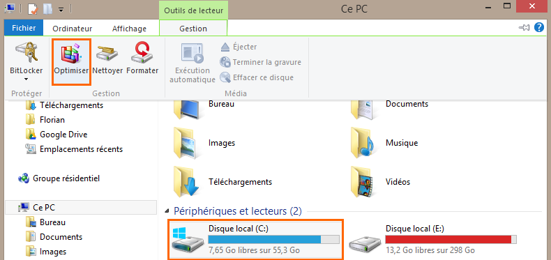 - Procédure pour Windows 8 : Afin de planifier les optimisations sous Windows 8, ouvrez l’explorateur de fichiers et sélectionnez un de vos lecteurs. Cliquez ensuite sur l’onglet « Gestion » et sur « Optimiser ».