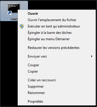 Accédez à l'Invite de commande en utilisant un raccourci si vous en avez un, ou en allant dans Démarrer puis en saisissant "cmd". Ensuite dans la liste des programmes qui apparaît, faites clic droit sur l'Invite de commande puis cliquez sur "Exécuter en tant qu'administrateur". En effet, ce que l'on va faire va modifier la configuration du système, ce qui nous oblige a exécuter l'invite de commande avec le maximum de privilège.
