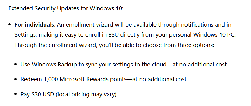 Pour les particuliers, le programme ESU (Extended Security Updates) représente une option payante, valable un an et facturée 30 dollars, pour continuer à obtenir des mises à jour de sécurité.