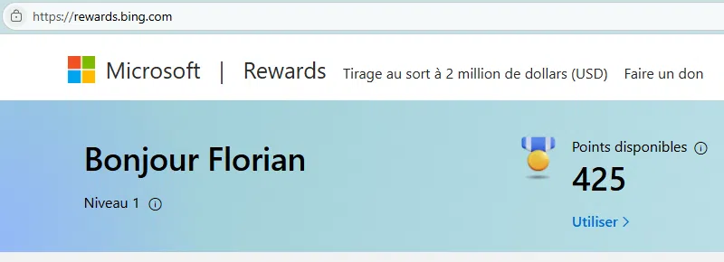 Vous pouvez consulter vos points à partir du site rewards.bing.com. Personnellement, j'utilise très peu Bing, je ne joue pas à la Xbox et je ne fais pas d'achat sur le Microsoft Store, et j'ai tout de même 425 points, donc prenez le temps de vérifier. L'important pour cumuler des points étant d'être connectés avec un compte Microsoft sur Windows et/ou Edge.