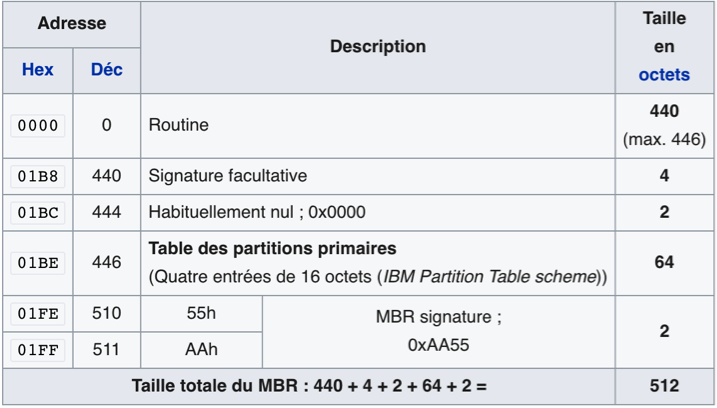 Le MBR contient, entre autre chose, la table des partitions. Selon le principe standard, il s’agit des quatre partitions primaires du disque dur. Ce secteur contient également la routine d’amorçage dont l’objectif est de charger le système d’exploitation via le chargeur d’amorçage (aussi appelé bootloader), lorsqu’il existe sur la partition active.