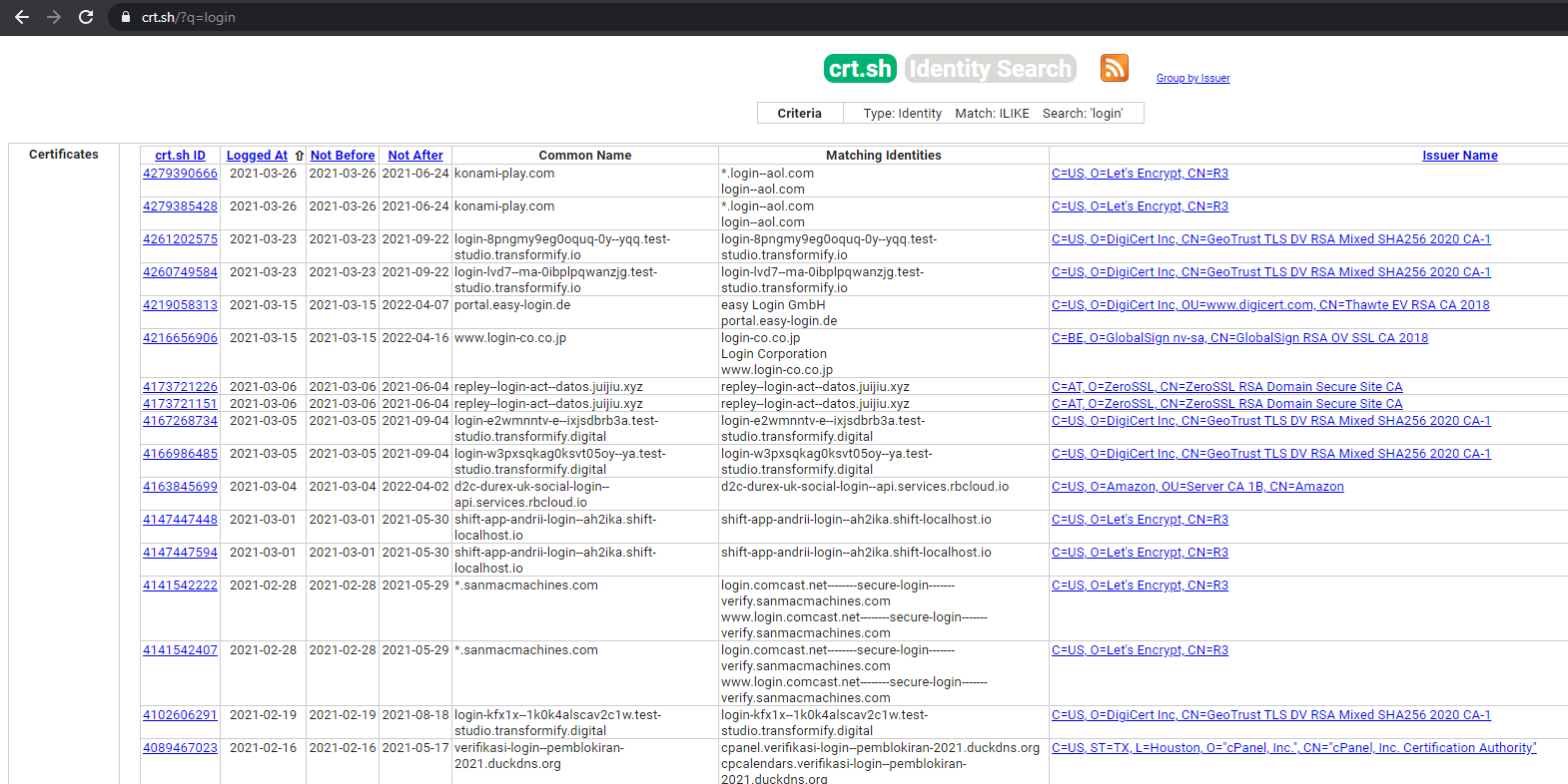 Toutefois, je remarque que pour des sites web très connus et grand public, il est assez aisé de trouver des pages de phishing actives, dont certaines sont là depuis assez longtemps (puisque parfois référencées sur Google). Pour des entreprises de taille plus modeste et potentiellement moins fréquemment ciblée par les attaquants, je pense qu'un monitoring régulier au travers la recherche des noms de domaine et en utilisant la transparence des certificats permet d'avoir une solution pertinente.