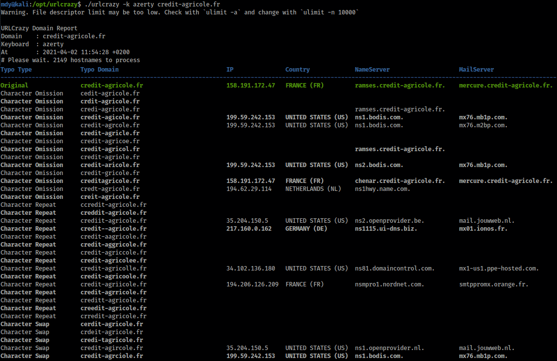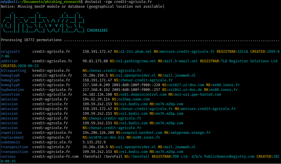 Celui-ci va générer une liste de noms de domaine à partir d'une entrée fournie en utilisant les méthodes citées précédemment. Pour chaque nom de domaine, il vérifiera son enregistrement auprès d'un serveur DNS mondial, ce qui vous permettra de détecter des cas suspects rapidement. Voici un exemple en utilisant le nom de domaine credit-agricole.fr :