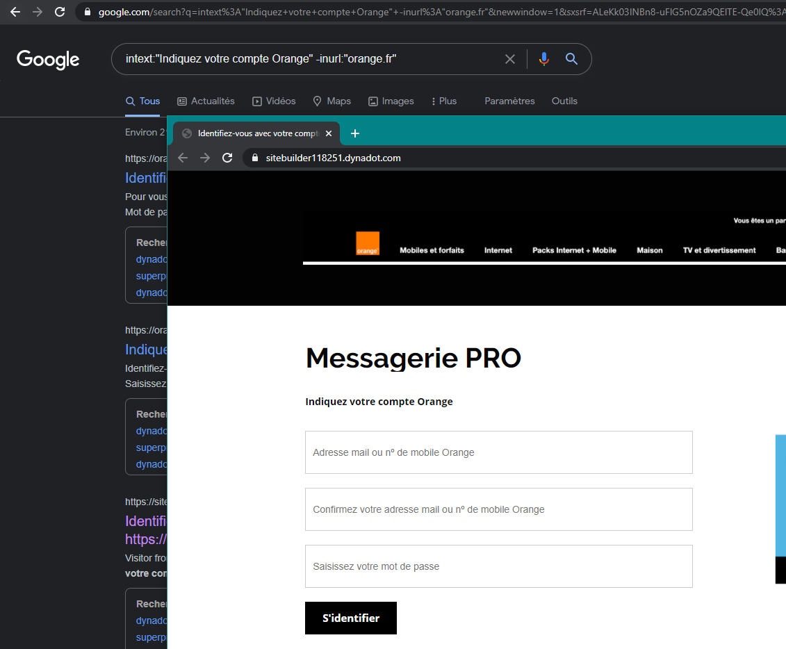 Cet élément caractéristique d'une page peut être utilisé afin de voir si d'autres sites n'utilisent pas le même, dans notre cas, il y aurait de très grandes chances qu'il s'agisse de page de phishing. Avec la requête Google suivante : intext:"Indiquez votre compte Orange" -inurl:"orange.fr", je tombe très rapidement sur plusieurs pages de phishing :