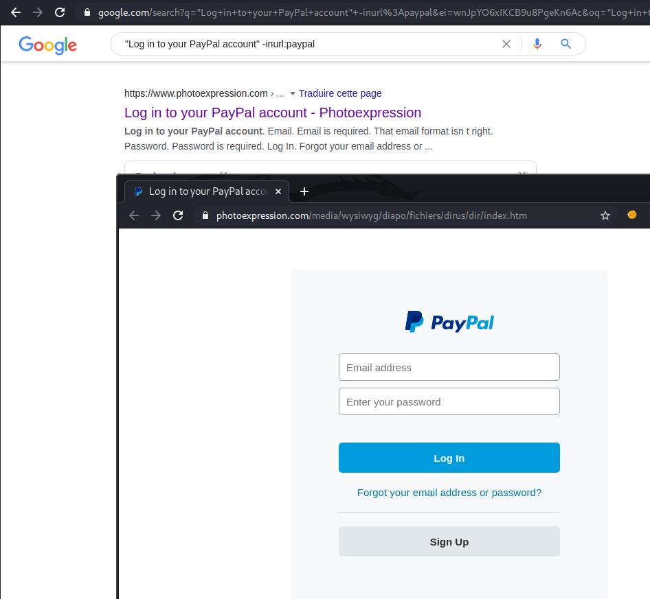 Une seconde méthode qui peut être utilisée est simplement l'utilisation de moteurs de recherche. De simples Google Dorks peuvent mener à la découverte de pages de phishing et d'autres moteurs de recherche, plus avancés, peuvent se révéler pertinents.
