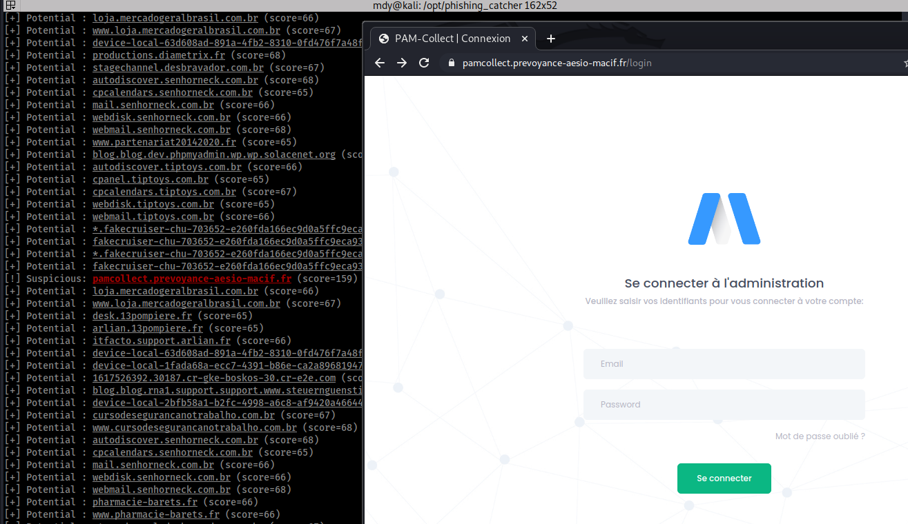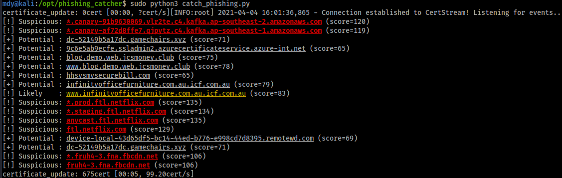 Également, il y a le projet https://github.com/x0rz/phishing_catcher, qui se base sur https://certstream.calidog.io/, monitor et affiche en direct les nouveaux certificats créés. Ces derniers peuvent être intéressants afin de mettre en place, dans la durée, une surveillance des potentielles attaques de phishing pouvant cibler vos utilisateurs.