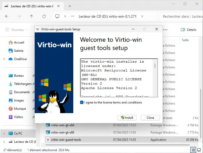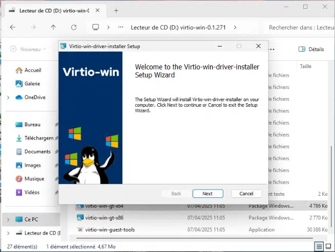 Pour finir l'installation, je vous recommande d'accéder au lecteur DVD correspondant à VirtIO Win pour lancer l'installation de deux paquets : virtio-win-gt-x64 (tous les pilotes) et virtio-win-guest-tools (l'agent Qemu et les outils invités d'une façon générale).