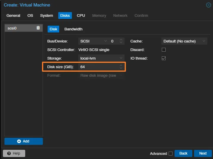 Vous devez spécifier la taille du disque dur principal de la machine virtuelle. Il est possible d'utiliser un disque SCSI, via le contrôleur VirtIO SCSI. Sachez que nous devrons installer un pilote lors de l'installation de l'OS. Ici, indiquez à minima 64 Go, car c'est un prérequis de Windows 11.