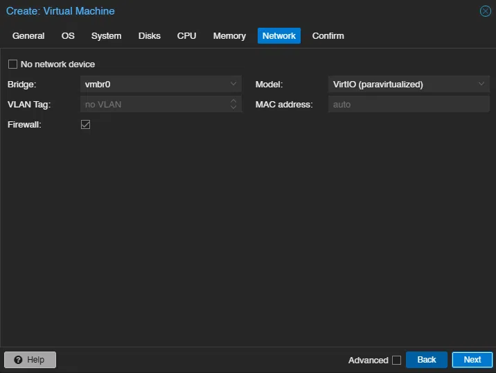 Connectez la VM sur un réseau, comme ici le réseau vmbr0 (créé par défaut). Concernant le modèle de carte réseau, vous pouvez choisir "VirtIO (paravirtualized)" ou un autre modèle, mais ce premier choix implique d'installer un pilote supplémentaire.