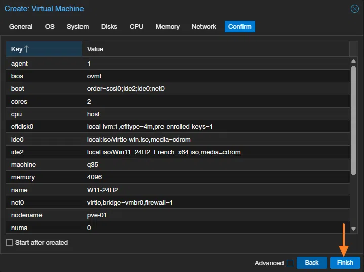 Vérifiez votre configuration et cliquez sur le bouton "Finish" pour finaliser la création de la VM.
