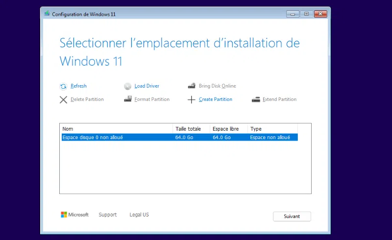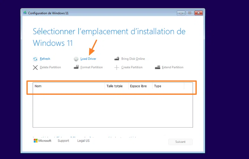 Nous allons uniquement passer en revue les étapes où il y a des blocages. Par exemple, au moment de sélectionner le disque sur lequel installer Windows 11, vous risquez d'avoir une mauvaise surprise : une liste vide ! Pas de panique, c'est parce que le pilote du contrôleur VirtIO n'est pas intégré à l'image ISO de Windows 11, mais nous avons prévu le coup... Cliquez sur le bouton "Load Driver".